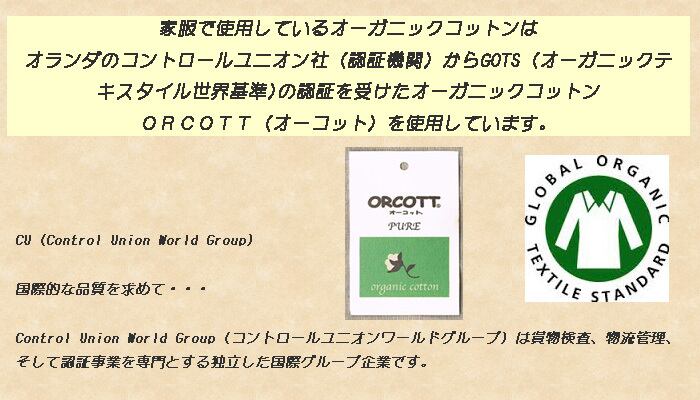 胸当てに使用しているオーガニックコットンは、オランダのコントロールユニオン社(認証機関)からGOTS(オーガニックテキスタイル世界基準)の認証を受けたオーガニックコットン、ORCOTT(オーコット)を使用しております